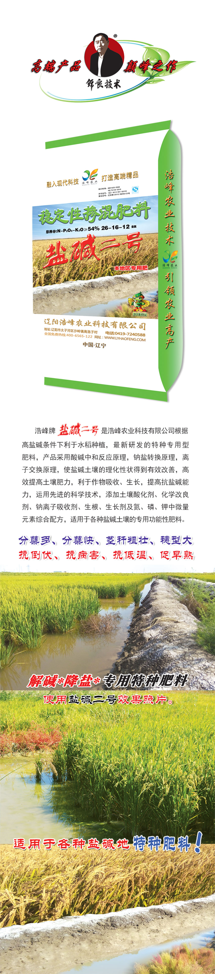 浩峰牌鹽堿二號是浩峰農業(yè)科技有限公司根據(jù)高鹽堿條件下利于水稻種植,最新研發(fā)的特種專用型肥料,產(chǎn)品采用酸堿中和反應原理,鈉鹽轉換原理,離子交換原理,使鹽堿土壤的理化性狀得到有效改善,高效提高土壤肥力,利于作物吸收、生長,提高抗鹽堿能力,運用先進的科學?,添加土壤藥F?、化学改良剂、脑u胱游占?、生根、生长剂及氮、磷、钾中微量元素综簢樹穭Μ室暶釉嶗种盐煎{寥賴淖ㄓ霉δ芐苑柿稀?